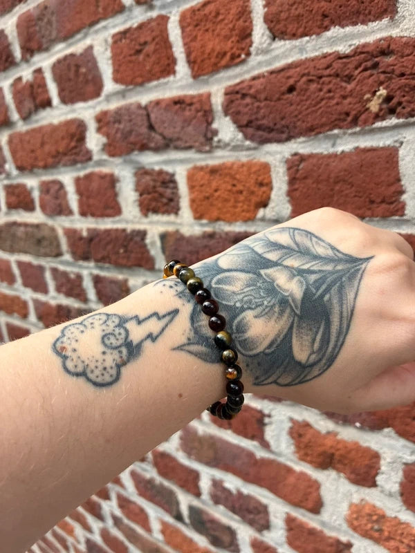 Un trio puissant et protecteur au poignet. Ce bracelet en perles de 6 mm associe les trois variantes de la pierre « œil » pour une synergie unique d’ancrage, de force et de clarté.